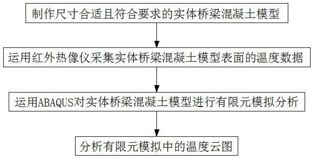 本发明公开了一种基于红外热成像检测混凝土桥梁隐伏病害的研究方法,根据任何温度高于绝对零度的物体都能向外辐射红外线能量的这一物理特性,从理论上建立混凝土桥梁隐伏病害与红外热图像之间的关联,构建有内部空洞缺陷的混凝土模型并对其进行有限元模拟分析,验证红外热成像法检测桥梁混凝土内部缺陷的可行性。其检测步骤包括:步骤一,制作尺寸合适且符合要求的实体桥梁混凝土模型;步骤二,运用红外热像仪采集实体桥梁混凝土模型表面的温度数据;步骤三,运用ABAQUS对实体桥梁混凝土模型进行有限元模拟分析;步骤四,分析有限元模拟中的温度云图。