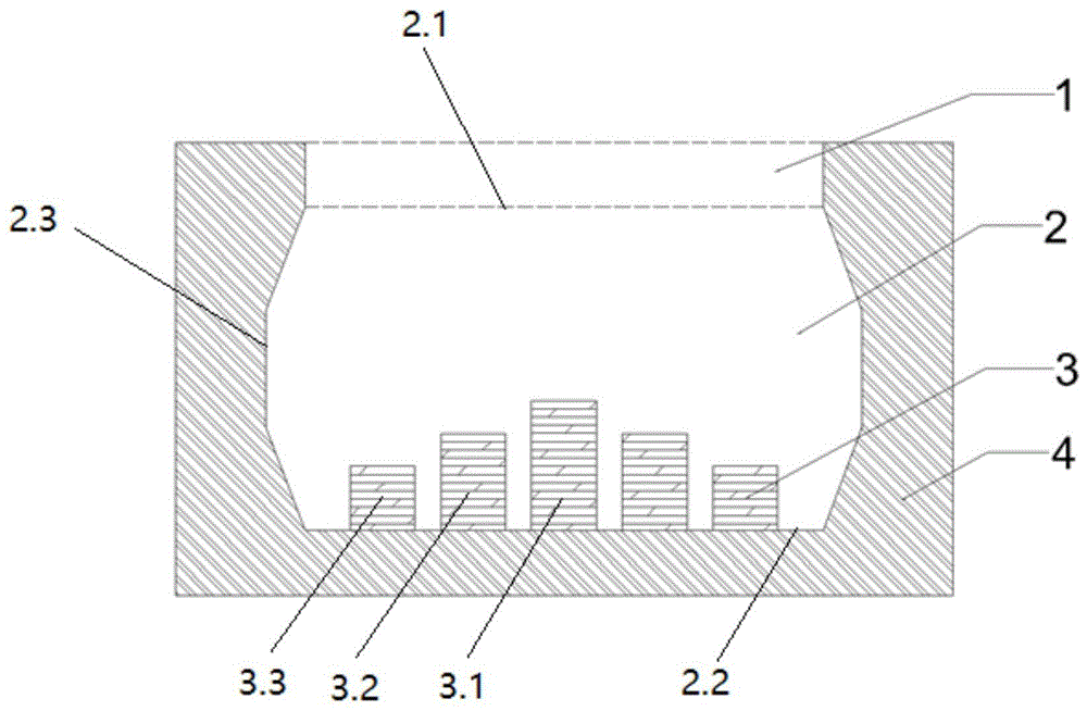 本实用新型公开了一种“都江堰”式多级底漩型稳流器,解决了现有稳流器稳流性能有待进一步提高、夹杂去除效果不佳的问题。技术方案包括开有空腔的本体,所述本体顶面开口与空腔连通,所述空腔的底面环形阵列式排布有多个导流墩,所述多个导流墩包括一个位于空腔底面中心的中心导流墩和外环设有的至少一层环形均布的多个外导流墩;所述中心导流墩和外导流墩的高度由中心至外环逐层降低。本实用新型结构简单、成本低、缓冲开浇钢液注流、减少二次氧化、有效捕捉和去除开浇夹杂,特别是降低钢液中大型夹杂量。