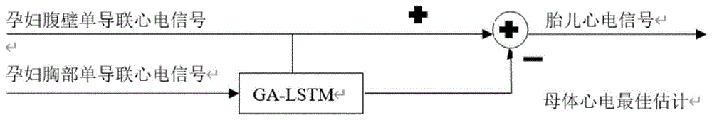 本发明属心电监测技术领域,公开了一种基于LSTM神经网络心电提取方法、系统、设备及介质,采用GA对LSTM网络的超参数作寻优处理,得出学习率、隐层神经元数和训练次数的最佳组合;利用寻优的参数组合构建的GA‑LSTM模型作为母体胸部心电信号与腹壁混合信号之间的非线性变换函数;在此基础上应用非线性变换函数计算母体胸部信号的最佳估计;从母体腹壁的混合信号中进行分离,即可分离提取得到最佳的胎儿心电信号的估计。本发明出的心电信号提取模型可以获取更为清晰的胎儿心电信号。