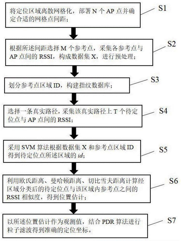 本发明涉及一种基于室内指纹定位的优化方法,包括:S1,将定位区域离散网格化,部署N个AP点并确定合适的网格点间距;S2,根据间距选择M个参考点,采集各参考点与AP点间的RSSI,构成数据集X,进行预处理;S3,划分参考点区域ID,构建指纹数据库;S4,选择一条真实路径,采集该真实路径上T个待定位点与AP点间的RSSI;S5,采用SVM算法根据数据集X和参考点区域ID得到待定位点区域的id;S6,利用欧氏距离、曼哈顿距离、切比雪夫距离计算经区域分类后的待定位点与该区域内参考点之间的RSSI相似度,得到位置估计;S7,以位置估计作为观测值,结合PDR算法进行粒子滤波得到准确的定位坐标。本发明利用区域分类算法来减小搜索空间大小提高效率,同时优化匹配算法提高定位精度。