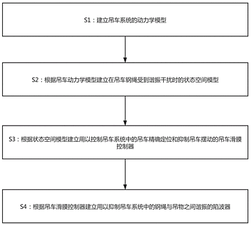 本发明提供一种吊车钢绳消谐防摆控制方法,属于桥式吊车防摆技术领域。该吊车钢绳消谐防摆控制方法S1:建立吊车系统的动力学模型;S2:根据吊车动力学模型建立在吊车钢绳受到谐振干扰时的状态空间模型;S3:根据状态空间模型建立用以控制吊车系统中的吊车精确定位和抑制吊车摆动的吊车滑膜控制器;S4:根据吊车滑膜控制器建立用以抑制吊车系统中的钢绳与吊物之间谐振的陷波器。本发明中的滑膜控制器可以控制吊车系统中的吊车精确定位和抑制吊车摆动,陷波器能够有效地抑制钢绳与吊物之间的谐振现象,减小摆动幅值,同时能够帮助滑膜控制器更加迅速精确地实现小车定位以及减弱吊车钢绳摆动。