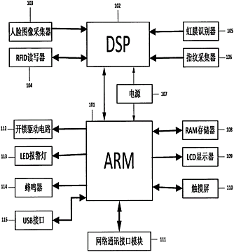 本实用新型涉及一种基于嵌入式的新型智能电子锁装置,包括:ARM(101)、DSP(102)、人脸图像采集器(103)、RFID读写器(104)、虹膜识别器(105)、指纹采集器(106)、电源(107)、RAM存储器(108)、LCD显示器(109)、触摸屏(110)、网络通讯接口模块(111)、开锁驱动电路(112)、LED报警灯(113)、蜂鸣器(114)、USB接口(115),ARM嵌入式系统根据DSP数据处理器的分析处理结果对智能电子锁进行各种运算和控制。系统具有人体多生物特征识别得特点,智能化程度高。本装置的安全性好、可靠性高、速度快,其准确性高、可操作性强,市场应用前景广阔。