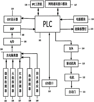本实用新型涉及一种新型多功能自动门控制系统,包括:PLC(101)、DSP(102)、A/D(103)、光电隔离器(104)、烟雾检测器(105)、火焰探测器(106)、红外探测器(107)、热探测器(108)、防夹感应器(109)、I/O接口(110)、自动门(111)、电机(112)、驱动机构(113)、D/A(114)、故障报警灯(115)、电源模块(116)、网络通讯接口模块(117)、IPC工控机(118)、CRT显示器(119);本系统具有网络通讯,监控管理的功能,是一个集消防、管理、智能化于一体的安全、稳定、可靠的自动门控制系统,具有多功能的特点,比传统自动门具有更广泛应用范围。