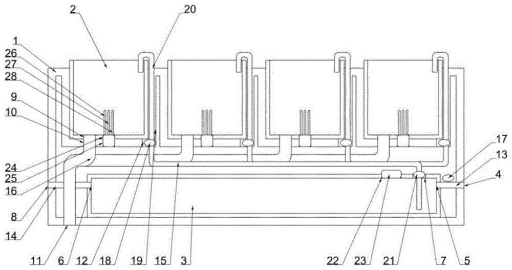 本发明属于花草种植设备技术领域,公开了一种智能花盆及控制方法,花盆主体上有八个坑位,放置八个定植盆,花盆主体下方设有水箱;水箱右侧表面中心上方加工第二圆形通孔,第二圆形通孔通过第一导管与第一圆形通孔连接,第一导管上设置有第一进水电磁阀;水箱上方加工第四圆形通孔,圆形通孔内设置水泵,水泵通过进水导管与第四圆形通孔连接;水泵通过进水导管与软管连接,软管上固定有第二进水电磁阀;软管放置于条形凹槽中,条形凹槽位于紧邻定植篮右侧的花盆主体表面,与第九圆形通孔紧邻。本发明设有进水电磁阀,不需要人员手动补充水分;内部设有水箱,若不方便连接水管也可手动供水。
