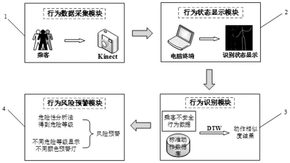 本发明公布了一种地铁乘客不安全行为风险评估系统,包括行为数据采集模块、行为状态显示模块、行为识别模块以及行为风险预警模块,所述行为数据采集模块中包括Kinect,且行为数据采集模块通过Kinect可采集乘客不安全行为的骨骼数据和相关深度信息得到乘客位置数据。本发明设有可实现四个功能模块的地铁乘客不安全行为风险评估系统。有益效果是:提高地铁管理人员对乘客不安全行为判断的便捷性和准确性,以行为导致的风险作为预警指标有助于决策人员准确估计风险形势,迅速做出应急响应。