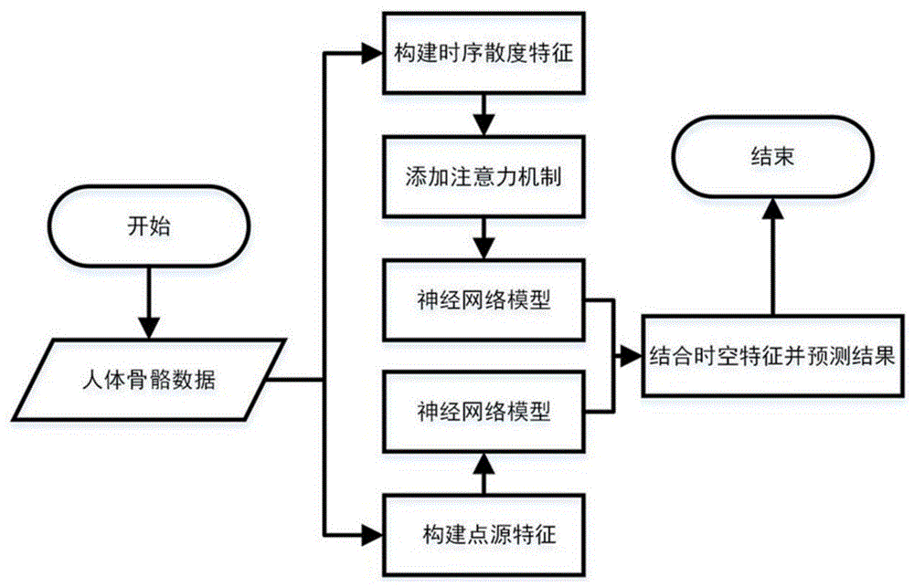 本发明公开了一种行为识别中人体骨骼数据的建模方法,包括如下步骤:S1、获取视频中的人体骨骼数据;S2、分别构建时序散度特征和点源特征;S3、在时序散度特征中为骨骼点添加注意力机制;S4、分别构建时序神经网络模型用于提取时序散度的抽象特征以及构建空间神经网络模型用于提取点源的抽象特征;S5、通过矩阵合并将步骤S4所述的两种抽象特征融合,得到预测结果。通过本发明所述建模方法建立的模型突显了人体骨骼点的运动表征;对于运动幅度较大的人体行为,本发明所提出的建模方法相比于传统的建模方法,具有更好的识别效果。