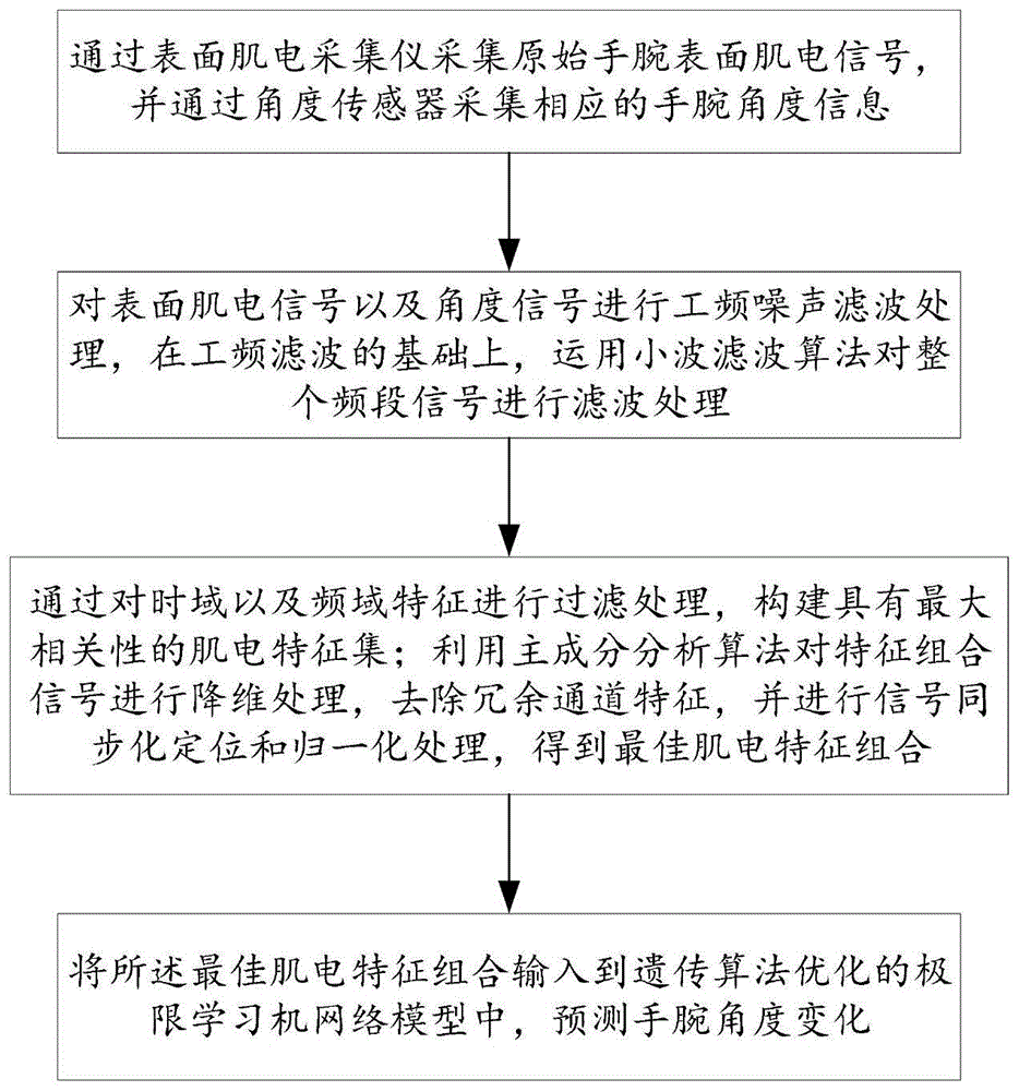 本发明涉及一种基于sEMG的不同负载下手腕角度预测方法及装置,本发明首先采集手腕表面肌电信号以及手腕角度;通过梳状滤波器以及小波滤波对信号进行预处理,得到最优的表面肌电信号以及角度信号;提取手腕表面肌电信号的时域特征以及频域特征,分析两种特征性质并对其进行特征组合,得到最优的特征组合方式;利用PCA降维技术对组合特征进行处理,去除冗余特征,并进行信号同步化定位,完成信号的归一化处理;最后将得到的特征输入到经过遗传算法优化的极限学习机网络中,得到手腕角度的预测结果。本发明充分考虑时域和频域特征来实现特征组合,可以在复杂的坏境下准确读取手腕信息,实现人机交互识别。