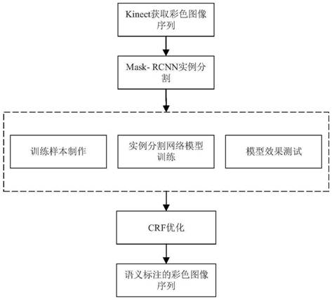本发明公开了一种基于Mask‑RCNN的语义信息提取方法,应用于语义地图构建环节,其特征在于结合深度学习实例分割算法Mask‑RCNN对室内物品进行不同个体的区分,对于语义地图中含有语义信息的图像精确标注并进行实例分割。对分割后的结果进行优化处理,使用DenseCRF算法对Mask‑RCNN分割后的图像边缘进行处理,使分割后的结果更加精确和平滑,提取到更加精确的环境信息,为后续语义地图构建奠定良好的基础,从而使移动机器人实现更好的人机交互。