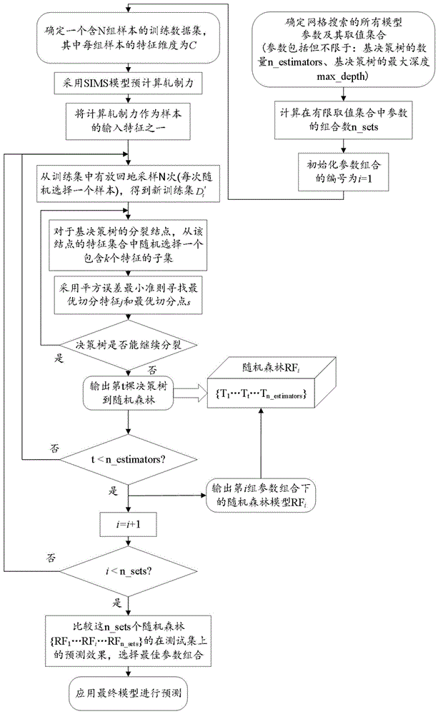 本发明提供一种基于随机森林的热连轧精轧轧制力设定方法,涉及热轧板带钢生产过程控制技术领域。本发明将SIMS轧制力模型的计算值作为模型的输入之一,即将其作为所有基决策树的备选特征之一,采用此种方式将SIMS模型随机与某些基决策树进行组合,通过有放回地采样得到采样训练集,基于采样训练集训练若干棵决策树进而组成随机森林,随机森林模型预测的轧制力为所有基决策树预测结果的平均,能有效改善单一机理模型预测精度与泛化能力不足的缺陷。