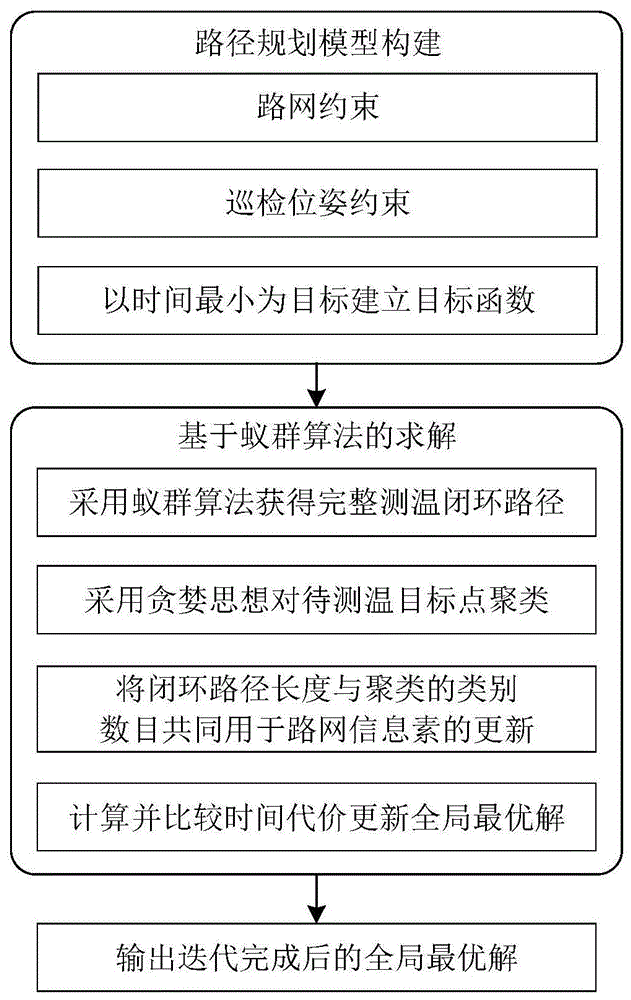 本发明公开了一种变电站巡检机器人路径规划方法,该方法包括以下步骤:1)根据地图构建机器人运动的路网约束模型;2)考虑机器人对目标进行测温时云台的姿态和测量视距的实际约束,结合测温点构建测温点巡检位姿约束模型;3)根据机器人运动的路网和测温点巡检位姿约束模型确定机器人停靠点集合;4)以完成巡检的时间最小为目标建立巡检机器人路径规划模型;5)对模型进行求解,输出全局最优解对应的巡检路径、各停靠点位置,以及各停靠点所对应的测温点集,作为变电站巡检机器人的执行测温任务时的路径规划方案。本发明方法解决了机器人在路网约束与位姿约束下携带热成像仪自主对高压线路温度检测的路径规划问题。