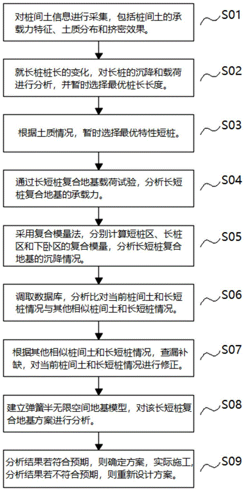 本发明涉及长短桩复合地基技术领域,且公开了一种长短桩复合地基调平的方法,先根据实际地质情况选择最优长度的长桩和最优特性的短桩,然后通过载荷试验分析长短桩复合地基的承载力,通过复合模量法分析长短桩复合地基的沉降情况,对长短桩复合地基方案做出初步预测,之后把当前长短桩复合地基方案与大数据中的其他长短桩复合地基方案进行对比,根据其他长短桩复合地基方案的后期沉降情况预测当前长短桩复合地基方案的后期沉降情况,预测更加的准确,不易产生偏差,并且,通过弹簧半无限空间地基模型能够对长短桩复合地基方案再次进行分析,进一步的确认长短桩复合地基方案的可行性,预防实际施工后长短桩复合地基沉降。