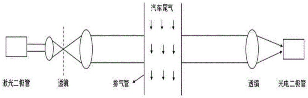 本发明公开了一种车载尾气颗粒物浓度的检测方法及设备,包括以下步骤:S1、由激光二极管发射一束固定波长的激光,激光光束穿过汽车排放的尾气烟团照射到光电二极管上产生相应的电信号;S2、入射光信号为定值,出射光信号随着尾气颗粒物浓度即不透光度增加而减小,光电二极管将产生的电信号送到运算放大器进行放大调理,然后进入单片机AD模块进行模数转换。该车载尾气颗粒物浓度的检测方法及设备,采用I/V转换电路,将光电二极管光电转换产生的电流信号转换为电压信号,通过放大电路对电压进行放大处理,再通过稳压电路,实现缓冲、隔离、阻抗转换以及提高带载能力,从而获得稳定的输出电压,减小了测量误差,提高了测量精度。