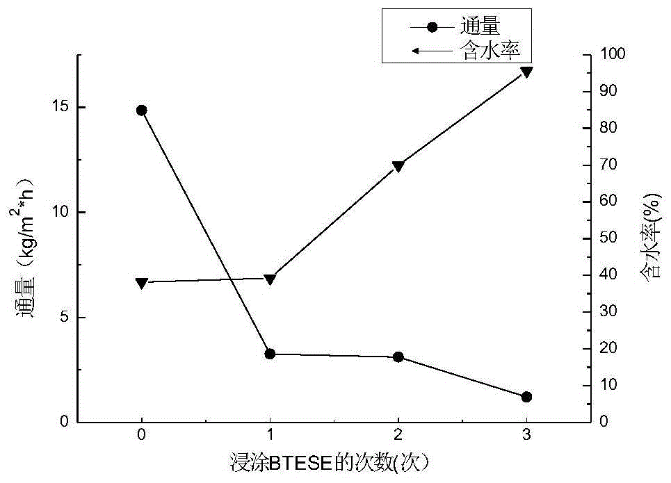 本发明的目的在于提供一种分离性能更高、耐高温、耐酸性T型分子筛与BTESE复合膜及其制备方法。具体提供了一种T型分子筛与BTESE复合膜的制备方法,包括以下步骤:1)对载体管进行预处理;2)配制T分子筛粗晶种溶液和T分子筛细晶种溶液,得到引入粗细晶种的载体管;3)将步骤2)得到的所述引入粗细晶种的载体管放置在母液中进行晶化反应4)配制BTESE溶液,然后将步骤3)得到的所述T型分子筛膜浸涂或擦涂BTESE溶液,然后烘烤,得到所述T型分子筛与BTESE复合膜。