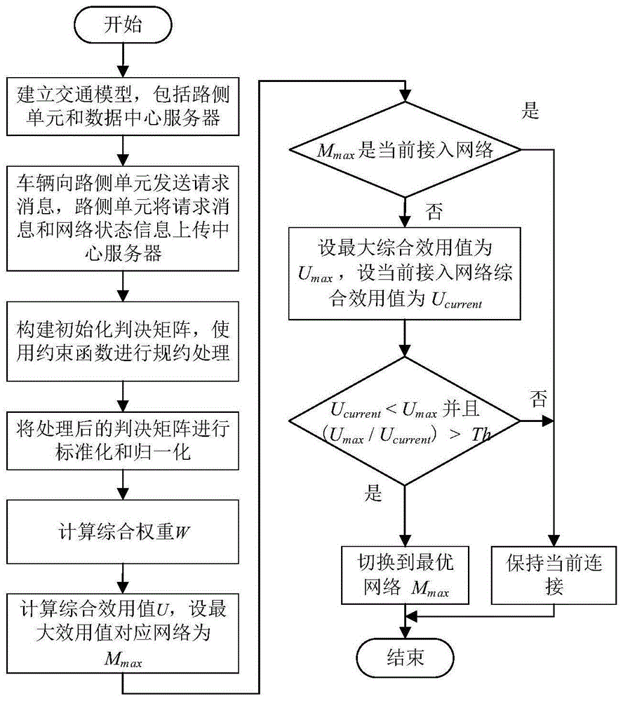本发明公开了一种基于多约束效用函数的异构车联网网络选择方法及系统,首先,处理上传到数据中心服务器的车辆请求信息和网络状态信息,构建网络属性参数初始化决策矩阵,并使用约束函数进行参数规约处理。然后,建立综合效用函数模型,从主观和客观角度对备选网络集合进行多属性决策,得到最大网络综合效用值。最后,利用切换阈值减少不必要的网络切换决策,保证最优的网络选择机制。本发明能适应城市交通环境下车流量和行驶速度的动态变化,在保证车辆用户服务质量体验的前提下,有效减少网络的切换次数,均衡网络的负载,提高网络资源的利用率。