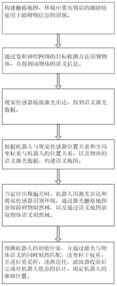 本发明提供一种基于语义似然估计的粒子滤波重定位方法,包括如下步骤:步骤S1:构建栅格地图;步骤S2:通过卷积神经网络的目标检测方法识别物体,并得到该物体的语义信息;步骤S3:利用视觉传感器模拟激光雷达,得到语义激光数据;步骤S4:构建语义地图;步骤S5:通过激光栅格地图获取障碍物似然域,通过语义地图获取物体语义似然域;步骤S6:确定机器人的准确位置。该方法充分结合了障碍物栅格信息和物体语义信息进行重定位,避免单使用激光雷达信息在相似的环境下定位失败的问题。克服了原本粒子滤波方法仅利用环境结构信息进行匹配的不足,能有效解决机器人全局重定位错误的问题,同时增强了重定位的收敛速度。