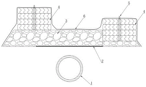 本实用新型公开了一种高耸建构筑物定向爆破撞击浅埋地下管道的防护结构。包括钢板2、减振坝3、轮胎4、防晒网6;所述钢板2铺设在浅埋地下管道1的地面上;所述第一层钢板201垂直于浅埋地下管道1的走向进行铺设;所述第二层钢板202沿垂直于浅埋地下管道1的走向进行铺设;所述减振坝3铺设在钢板2上方,截面为直角梯形;所述轮胎4为废旧卡车轮胎,第一组卡车轮胎401铺设在减振坝3迎向待拆除的建构筑物一侧的上底面边缘处,铺设长度与减振坝3相同,第二组卡车轮胎402铺设在减振坝3另一侧直角边缘处,铺设长度与减振坝3相同;所述防晒网6铺设范围需完全包裹住整体防护结构。本防护结构受到冲击,缓冲时间长,无渣石飞散伤人和造成二次粉尘污染。