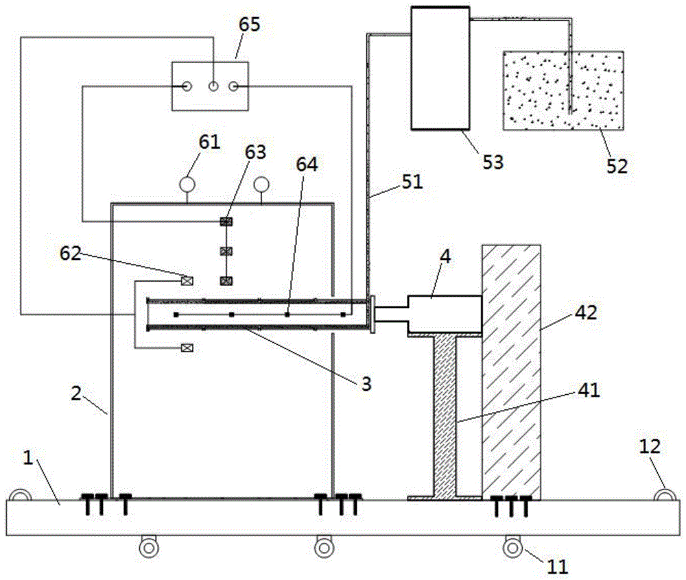 本发明公开了一种顶管模型试验装置,包括试验台、拼接式试验箱、顶管模型、横向加载装置、注浆系统和数据采集系统,拼接式试验箱装配于水平设置的试验台上端,其上端敞口,内部装有模型土体,拼接式试验箱一侧侧壁上设有供顶管模型进出的出入口,顶管模型为由多节管体依次对接拼装组成,且相邻两节管体拼接处设有注浆口,顶管模型水平设置,其一端由出入口进入模型土体内,横向加载装置与顶管模型的另一端传动连接,用于向模型土体内水平顶推顶管模型,注浆系统的注浆管由顶管模型的另一端伸入其内部,并在每个注浆口处连通设有注浆支管。优点:模拟程度高,能够准确测试顶管顶进过程中土体的沉降及内部压力变化,试验数据比较准确。