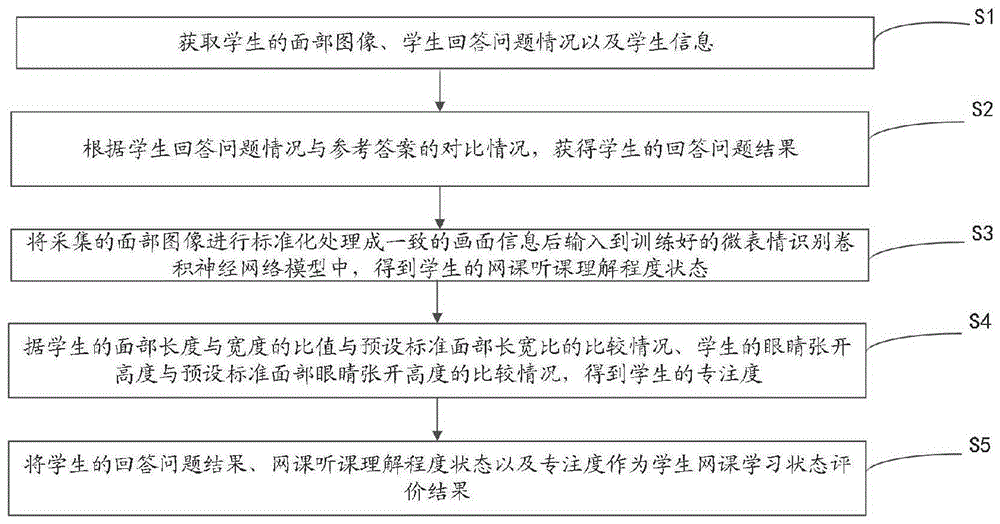 本发明公开了一种基于面部识别的学生网课学习状态评价方法,包括:获取学生的面部图像、学生回答问题情况以及学生信息;根据学生回答问题情况与参考答案的对比情况,获得学生的回答问题结果;将采集的面部图像进行标准化处理成一致的画面信息后输入到训练好的微表情识别卷积神经网络模型中,得到学生的网课听课理解程度状态;根据学生的面部长度与宽度的比值与预设标准面部长宽比的比较情况、学生的眼睛张开高度与预设标准面部眼睛张开高度的比较情况,得到学生的专注度;将学生的回答问题结果、网课听课理解程度状态以及专注度作为学生网课学习状态评价结果。本发明的方法可以提高识别效率,改善评价效果。
