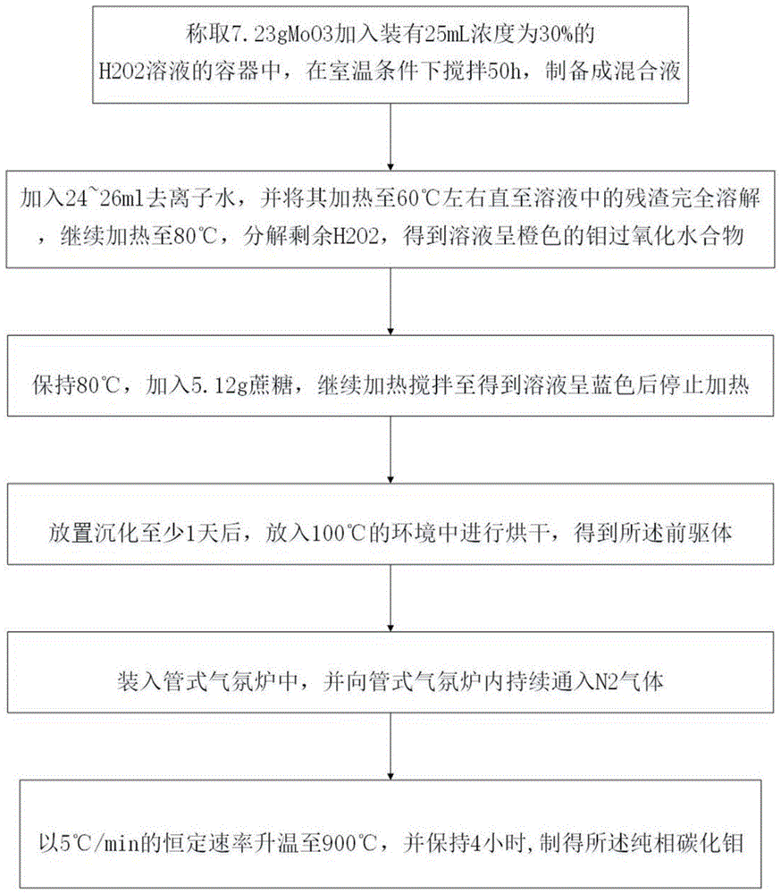 发明提供一种具有高电催化制氢活性的超薄碳化钼纳米片制备方法,用程序升温法在900℃下合成了超薄碳化钼纳米片,并将合成的超薄碳化钼纳米片样品用于电催化制氢反应催化剂,电化学测试结果表明,超薄碳化钼纳米片样品在碱性条件下具有很好电催化析氢活性,在电流密度为10mA/cm