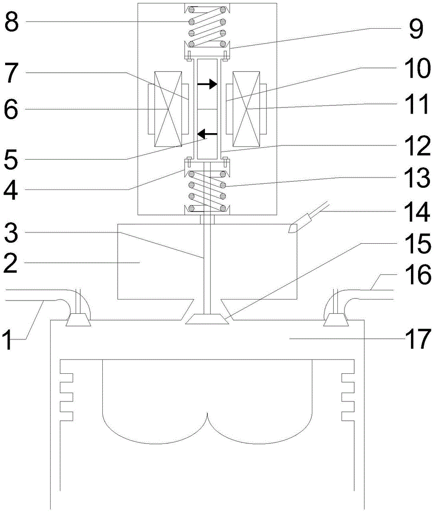 本实用新型公开了一种二甲醚和天然气发动机主副燃烧室通道阀门控制装置。用音圈电机来控制主副燃烧室通道阀门的开启和关闭,控制阀门位于二甲醚发动机主燃烧室和副燃烧室的通道中。控制阀门的杆与音圈电机的下弹簧座通过螺纹连接。本实用新型的阀门控制装置采用动磁式音圈电机控制阀门的开启和关闭,可以调节阀门的升程和正时,根据发动机的工作状态,更好的优化燃烧效果,音圈电机具有响应速度快,噪声小,结构简单、体积小等特性。且动磁式音圈电机相比动圈式音圈电机,不存在动圈式音圈电机的飞线问题和线圈的散热问题,可以更好的保证发动机的工作效率。
