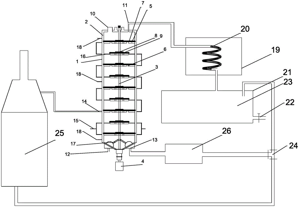 一种废旧橡胶连续热解与出料系统,包括热解反应器、冷凝系统和回收系统,所述热解反应器包括壳体、安装在所述壳体中轴线上的转轴、安装在所述壳体上且与所述转轴相连的驱动组件、多块安装在所述转轴上的热解盘、安装在所述转轴上且与所述热解盘上表面贴合的刮料装置,所述壳体顶部设置有进料口和油气出口,所述壳体底部设置有出料口和进气口,所述油气出口与冷凝系统入口相连,冷凝系统出口与回收系统入口相连,回收系统的顶部出口管分为两个支路与热解反应器相连,本实用新型能将废旧橡胶热解产出焦油和炭黑,节能环保,热量利用充分,产品回收利用率高。