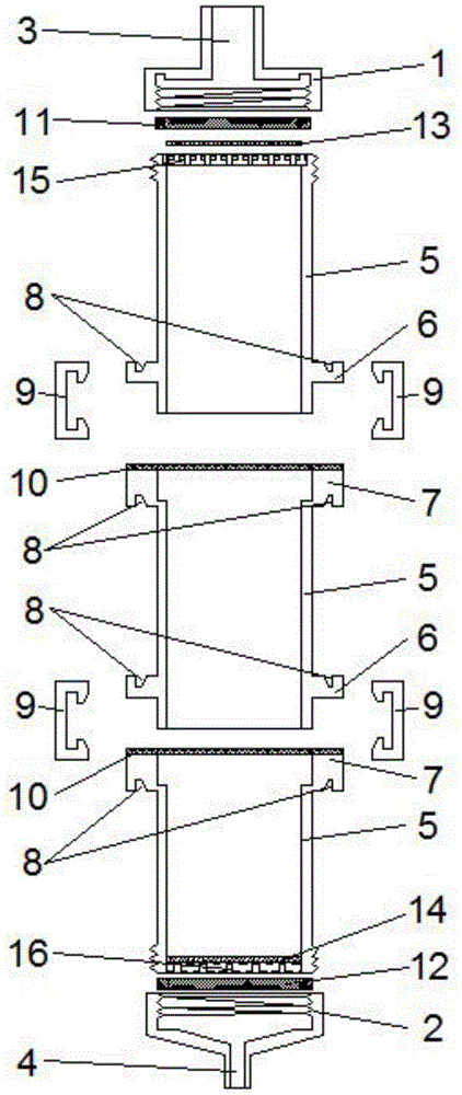 本实用新型涉及一种用于离子色谱法测定水中阴离子的水样前处理装置,包括上盖、上下两端均敞口的主筒体和下盖,主筒体竖直设置,上盖和下盖分别可拆卸的安装在主筒体的上端和下端的敞口处,其上分别设有进样孔和出样孔;主筒体由多个两端均敞口的短筒拼接而成,相邻两个短筒之间可拆卸连接;每个短筒内填充有固体萃取剂。本实用新型的有益效果是可实现水样多次过滤,水样过滤效果较佳;结构简单,拆装方便,便于清理,省时省力。