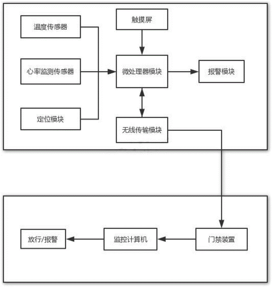 本实用新型提出了一种施工安全监护系统,包括:智能监护手环、门禁装置、监控计算机;智能监护手环由手环、智能监护装置构成,智能监护装置置于手环上;智能监护装置由微处理器模块、心率监测传感器、温度传感器、定位模块、报警模块、触摸屏、无线传输模块构成;微处理器模块分别与的心率监测传感器、温度传感器、定位模块、报警模块、触摸屏、无线传输模块依次有线连接;无线传输模块与监控计算机无线连接;监控计算机与门禁装置有线连接。本实用新型可采集工人的实时体温、实时心率以及实时位置,结合监控计算机对工人的健康状态进行实时监控,并结合门禁装置提醒工人进入施工区域。本实用新型提高了安全管理水平且发送事故时可以及时处理。