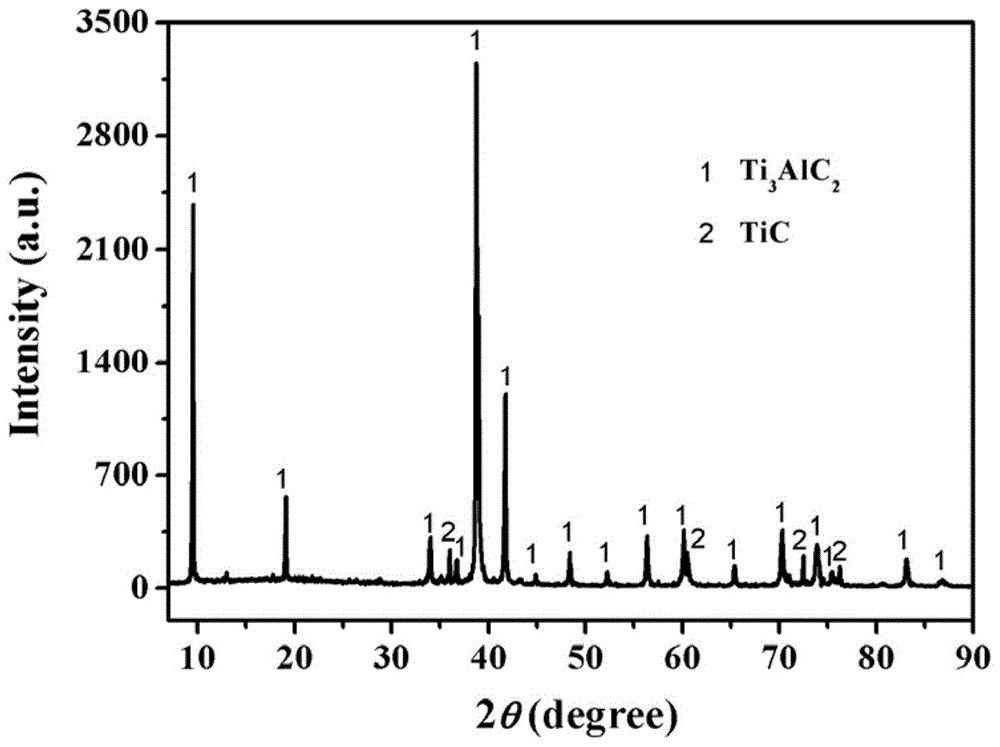粉体及其制备方法。其技术方案是:以钛粉、铝粉和石墨为反应物料,以氯化钠和氯化钾为熔盐介质,将反应物料与熔盐介质球磨,球磨后的球磨料放入氧化铝坩埚内,再将氧化铝坩埚放入保温结构匣钵中,用碳化硅粉填充保温结构匣钵与氧化铝坩埚间的间隙,然后将保温结构匣钵放入微波炉中;在氩气气氛下以三种升温速率先后升温至440~460℃、590~610℃和900~1200℃,在900~1200℃条件下保温5~60min,随炉冷却至室温;最后经研磨、水洗、抽滤和干燥后,制得Ti