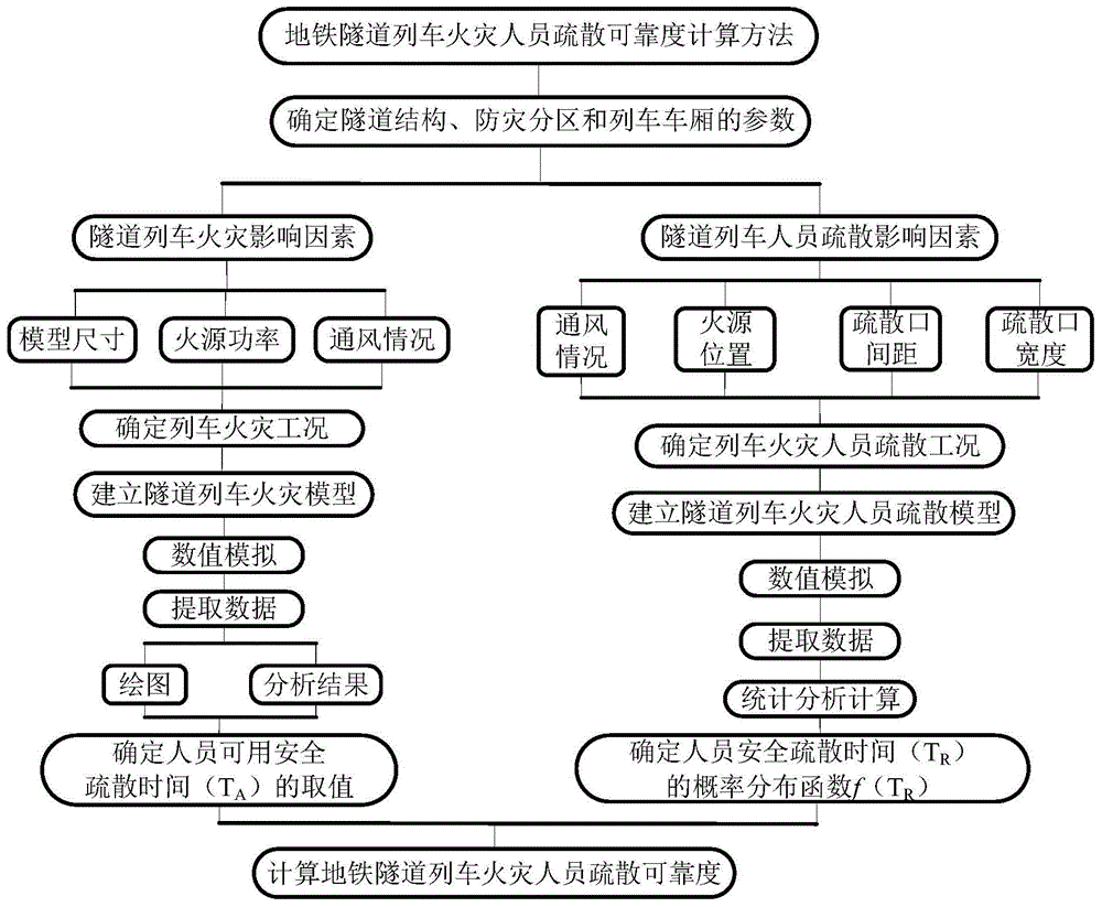 本发明涉及一种用于地铁隧道列车火灾人员安全疏散可靠度的计算方法,包括以下步骤:确定隧道列车火灾的影响因素以及隧道列车人员疏散的影响因素;根据上述影响因素分别确定隧道列车火灾工况以及列车火灾人员疏散工况;分别建立列车火灾模型和列车火灾人员疏散模型;通过数值模拟得到不同火灾工况下的人员可用安全疏散时间数值(T