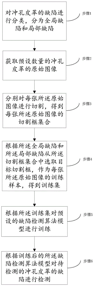 本发明公开了一种用于冲孔皮革缺陷检测方法及系统,涉及皮革缺陷检测领域。该方法包括:对冲孔皮革的缺陷进行分类,分为全局缺陷和局部缺陷;获取预设数量的冲孔皮革的原始图像;分别对每张所述原始图像进行切割,得到每张所述原始图像的切割框集合;根据所述全局缺陷和所述局部缺陷从所述切割框集合中选取目标切割框,作为每张所述原始图像的训练样本,得到训练集;根据所述训练集对预设的缺陷检测算法模型进行训练;根据训练后的所述缺陷检测算法模型对待检测的冲孔皮革的缺陷进行检测。本发明适用于皮革的检测,能够解决检测方法计算量大的问题,达到准确快速检测缺陷类别的效果。
