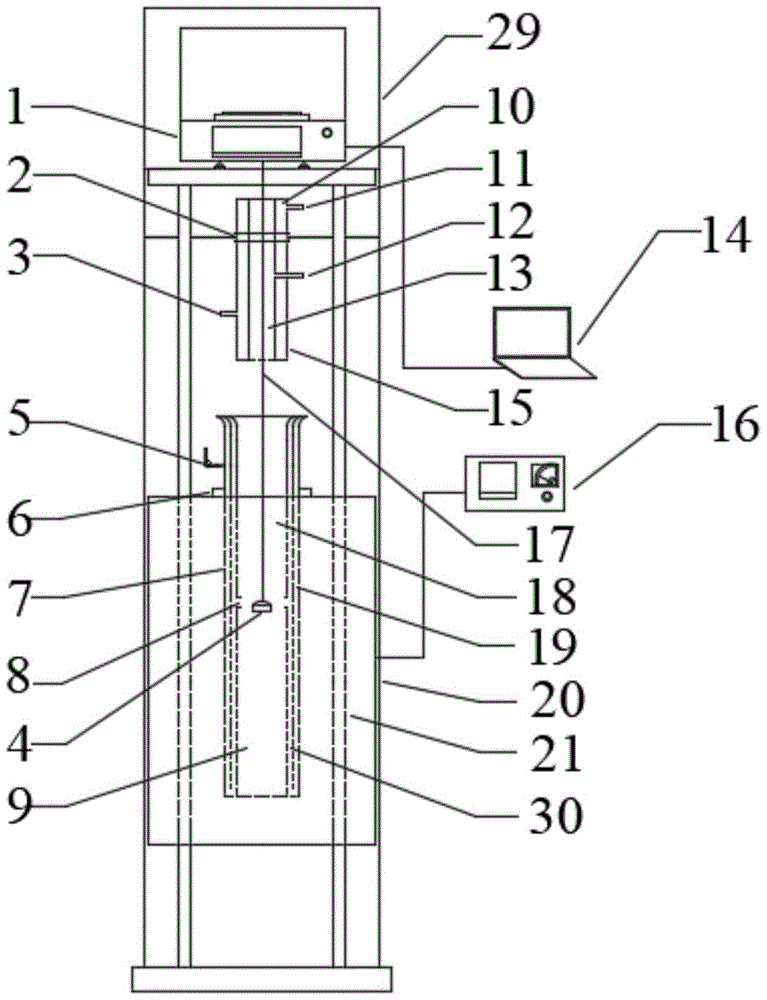 本实用新型涉及一种多因素耦合作用下的蒸发速率测量装置,包括称量系统、加热系统、反应器系统,称量系统由电子天平,吊杆,吊篮组成。加热系统由加热炉体,升降装置,热电偶和温度控制器组成。反应器系统分为环形冷却取样管,气流喷吹三层反应器,它们通过磨砂口连接。电子天平放在装置台架的顶部,吊篮由吊杆悬吊在反应器中,加热炉体安装在装置台架的升降丝杠上,环形冷却取样管由固定框固定在装置架的中上部位置,气流喷吹三层反应器置于加热炉体中心部位。本实用新型可以在预设的环境条件下尤其指不同风速条件下,同步记录电子天平的重量数据和气体流量计的流量,制图获得试样的蒸发速率。