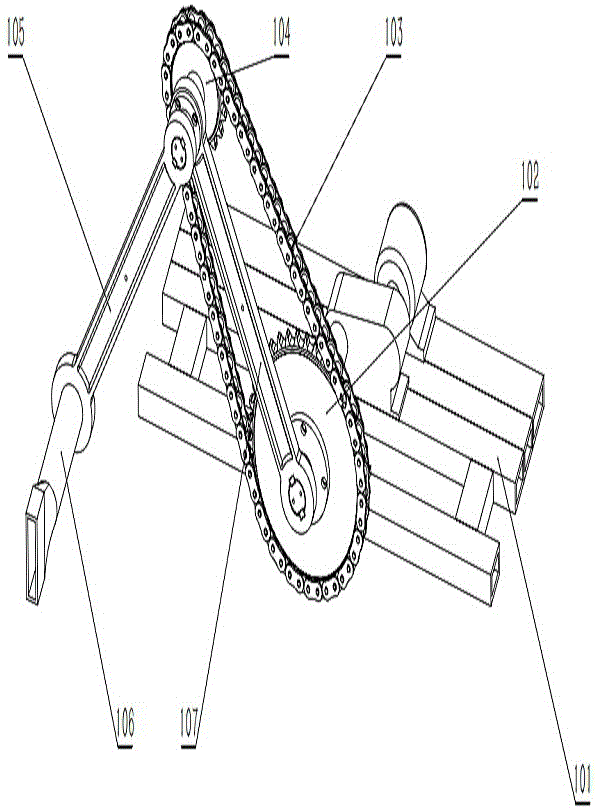 本实用新型提供了一种联动关节平面机械臂,结构包括:机架、大链轮、链条、小链轮、连杆、末端装置、曲柄、电机、减速器、轴1、轴2、链轮固定块。其特征有四点:一是机械臂能根据情况自由伸缩;二是与市面上的机械臂相比,减少一个关节驱动,只需一个电机即可,并可加装减速器以提高驱动扭矩,既減轻了重量,又节约了成本,并且通过机械传动机构严格保证运动轨迹稳定可靠,降低了控制难度;三是当曲柄与连杆的长度相等、且大小链轮的齿数比为2:1时,能实现机械臂末端装置沿直线运动;四是曲柄能360度灵活旋转并驱动末端装置的左右往复移动,保证工作具有连续性。
