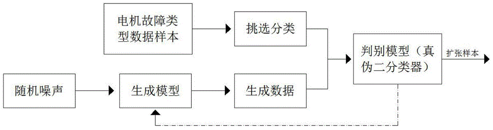 本发明公开了基于深度卷积生成式对抗网络的电机故障数据的增强方法,包括电机故障类型数据样本和随机噪声,随机噪声能够整合为生成模型,根据判别模型,来对生成数据和电机故障类型数据进行分类整合,从而达到扩张电机故障类型数据的效果。该基于深度卷积生成式对抗网络的电机故障数据的增强方法,它根据电机运行过程产生的各种信息,建立学习模型,通过不断学习和训练,预测电机运行是正常还是发生了异常,识别电机故障类型,还能实现电机在带负荷运行时,或不拆卸情况下,通过对其状态参数的检测和分析,判定是否存在故障及故障的位置的原因,并对电机未来的状态进行预测。