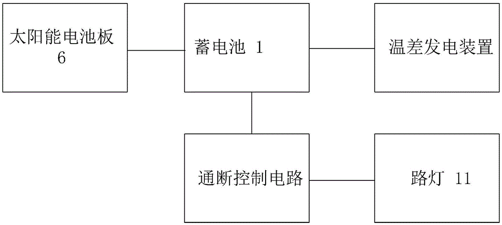 本实用新型公开了一种路灯装置,包括太阳能电池板、温差发电装置、通断控制电路、路灯和蓄电池,所述太阳能电池板和所述温差发电装置均与所述蓄电池电连接,所述通断控制电路串接于所述路灯与所述蓄电池之间。本实用新型通过使用太阳能电池板和温差发电装置两种装置对蓄电池供电,蓄电池再通过通断控制电路对路灯进行供电,使得产生的电量更多,适用的范围更广,光照更稳定,能源独立性更强,使路灯在阳光不足时,也能获得较为充足的电能供应,有效解决电能自足的问题,还具有结构简单、安装方便、易于维修的优点。