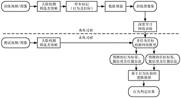 本发明公开了属于安全监管和图像处理与分析领域的一种基于深度学习与行为先验的吸烟和打电话检测方法。该方法包括离线和在线两个过程:离线过程通过自建吸烟和打电话行为图像数据集训练一个多任务的目标检测深度卷积神经网络,在线过程则利用训练好的深度网络模型对输入图像或视频帧经人脸检测后进行前向推理,先初步预测出吸烟或打电话行为的标签、置信度和位置信息,同时也预测出与这些行为相关的特定目标即人手、香烟或手机等的标签、置信度和位置信息,再根据行为发生时的先验知识,建立这些信息之间的逻辑推理规则,进一步判定吸烟或打电话行为是否发生。