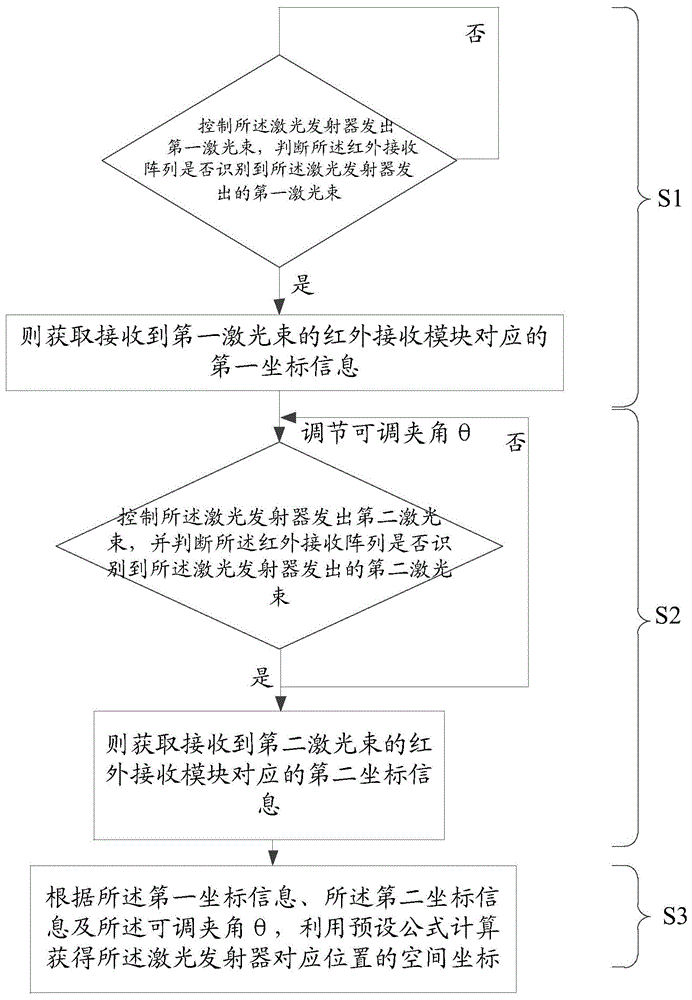 本发明涉及一种室内定位系统及控制方法,所述方法包括如下步骤:判断红外接收阵列是否识别到激光发射器发出的第一激光束,若是,则获取接收到第一激光束的红外接收模块对应的第一坐标信息并执行下一步,若否,则重复本步骤;控制激光发射器发出第二激光束,并判断红外接收阵列是否识别到激光发射器发出的第二激光束,若是,则获取接收到第二激光束的红外接收模块对应的第二坐标信息并执行下一步,若否,则重复本步骤;根据第一坐标信息、第二坐标信息及可调夹角θ,利用预设公式计算获得所述激光发射器对应位置的空间坐标;本发明定位系统采用红外接收模块,成本较低,定位精度较高,可快速获取室内设置的机械臂及待抓取物体的空间坐标。