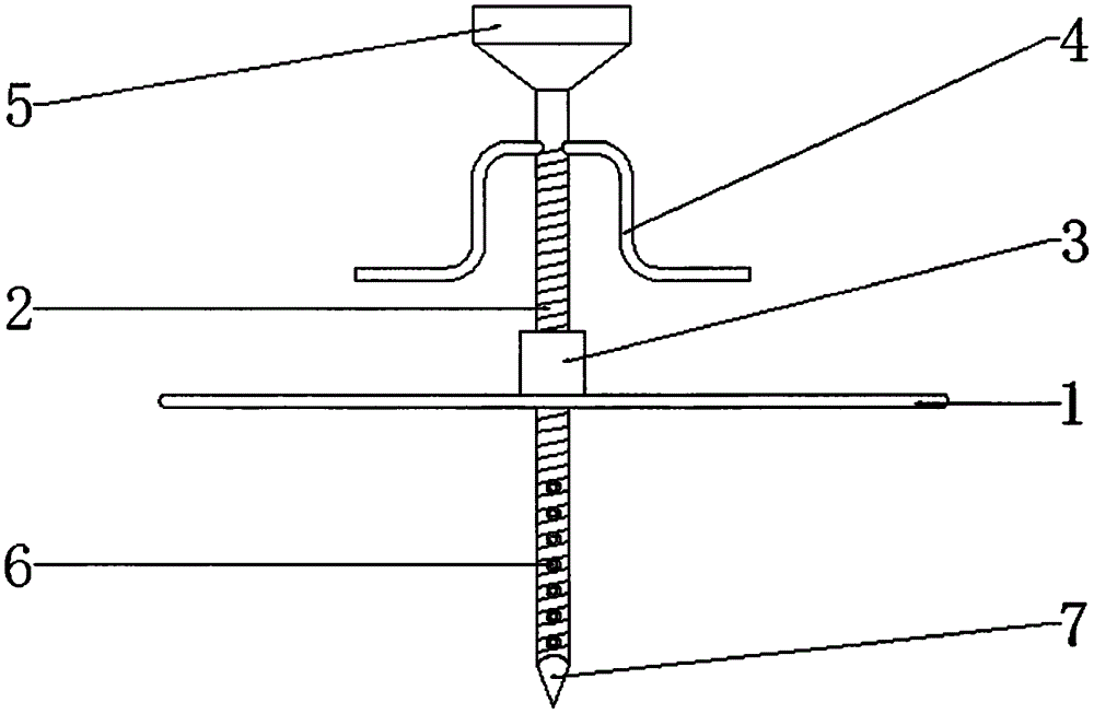 本发明公开了一种岩土工程直剪稳定装置,涉及岩土工程领域,该岩土工程直剪稳定装置在使用时可先将支撑板贴在岩土层地面上,然后将螺纹灌注管的钻头旋入螺纹筒内,然后手握转柄转动螺纹灌注管,将螺纹灌注管钻入岩土层内部合适深度。将熔融状态的聚氨酯注浆灌入料斗内,然后用电动按钮遥控电动遥控密封门打开,通过螺纹灌注管将聚氨酯浆液注入岩土层的裂缝中,待聚氨酯浆液凝固便可起到将岩土体稳定的作用。该岩土工程直剪稳定装置可以手动操作,对岩土层较浅地区进行注浆加固处理,结构简单,维修方便,成本低廉,可大规模推广使用。