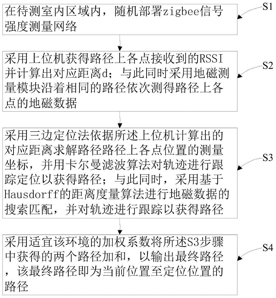 本发明涉及无线传感网络技术领域,提供了一种基于地磁强度的卡尔曼滤波室内轨迹跟踪算法,包括S1‑S4四个步骤。本发明涉及一种基于地磁强度的卡尔曼滤波室内轨迹跟踪算法,通过借助地球磁场强度在每个位置的唯一性的定位功能,并合理运用三边定位法以及卡尔曼滤波对轨迹进行计算,最后通过路径加和得到最终的路径,可以使得处于运动状态时依然能够有更高的定位精度。