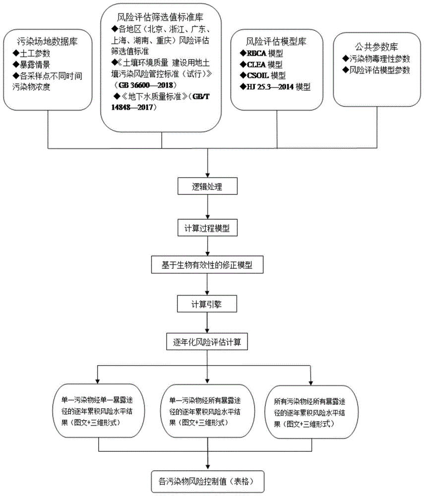 本发明涉及污染场地风险评估、信息处理、计算机程序及环境治理等技术领域,具体涉及一种用于污染场地逐年化风险评估系统的架构方法,包括以下步骤:(a)建立污染场地风险识别领域的污染场地数据库;(b)建立污染场地风险识别领域的风险评估筛选值标准库;(c)建立污染场地风险识别领域的风险评估模型库;(d)建立污染场地风险识别领域的公共参数库;(e)采用计算机逻辑处理工具对以上数据库之间的关系进行处理;(f)建立污染场地风险识别过程的计算过程模型;(g)建立污染场地风险识别的基于生物有效性的修正模型;(h)进行不同数据量的计算;(i)输出结果。本发明的方法基于计算机技术实现对污染场地的逐年化风险评估。