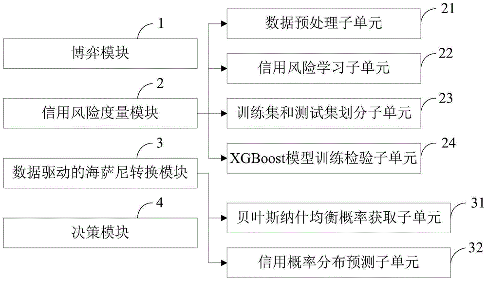 本发明属于互联网金融技术领域,公开了一种基于XGBoost驱动的海萨尼转换金融决策处理系统,首先构造出不完全信息互联网贷款信用博弈模型;然后采用统计学习方法度量贷款申请者的信用风险;接着进行信用风险驱动的海萨尼转换;最后基于博弈论和统计学习对互联网金融企业的贷款决策给出建议。本发明通过信息处理系统可以解决互联网金融中贷款申请者的信用风险度量问题,从而帮助互联网金融企业科学定量地认识贷款申请者,进一步分析他们之间的博弈关系时,可以帮助企业在处理申请贷款时做出正确的贷款决策,并制定出规避或控制风险的应对措施,保持企业健康的发展态势,促进互联网金融的健康稳定发展。