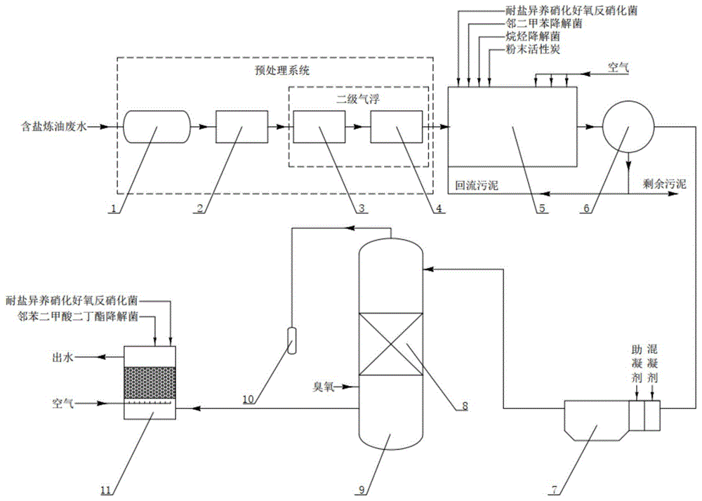 本发明公开了一种含盐炼油废水深度处理的方法。其技术方案是:经预处理后的含盐炼油废水进入曝气池(5),投加粉末活性炭,再同时投加烷烃降解菌、邻二甲苯降解菌和耐盐异养硝化好氧反硝化菌进行生物强化处理。然后依次进入二沉池(6)和高密度沉淀池(7)进行沉淀处理;沉淀处理后泵入臭氧催化氧化塔(9),向臭氧催化氧化塔(9)投加臭氧;臭氧催化氧化塔(9)排出的尾气经臭氧破坏器(10)分解。最后向后生物处理池(11)的含盐炼油废水投加邻苯二甲酸二丁酯降解菌和耐盐异养硝化好氧反硝化菌。经后生物处理后的出水:COD、NH