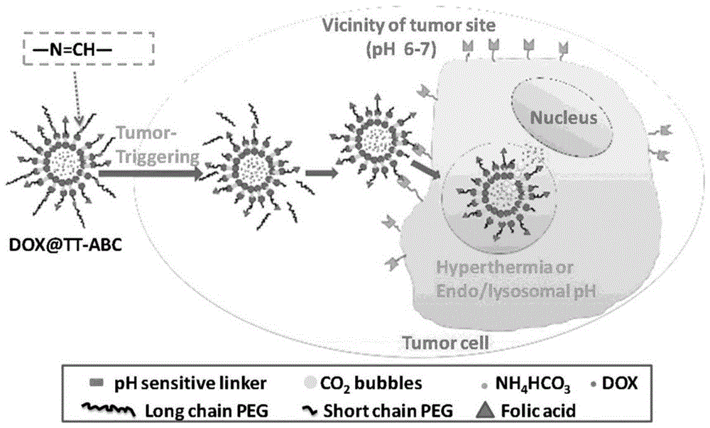 本发明公开了一种肿瘤触发靶向碳酸氢铵脂质体的制备方法、应用。利用磷脂酰乙醇胺(PE)和甲氧基聚乙二醇醛(mPEG‑CHO)合成了含有pH敏感的亚胺键的长链PEG化磷脂(PE‑imine‑PEG)。然后以磷脂、胆固醇、PE‑imine‑PEG、DSPE‑PEG‑folate和碳酸氢铵(ABC)水溶液为原料,制备肿瘤触发靶向碳酸氢铵脂质体纳米材料。本发明的肿瘤触发靶向碳酸氢铵脂质体不仅具有血液中的长循环特性,而且在肿瘤微环境中能开启其靶向特性。通过叶酸配体‑受体作用,它能进入肿瘤细胞,在升高的温度或酸性的内涵体/溶酶体中会产生二氧化碳(CO