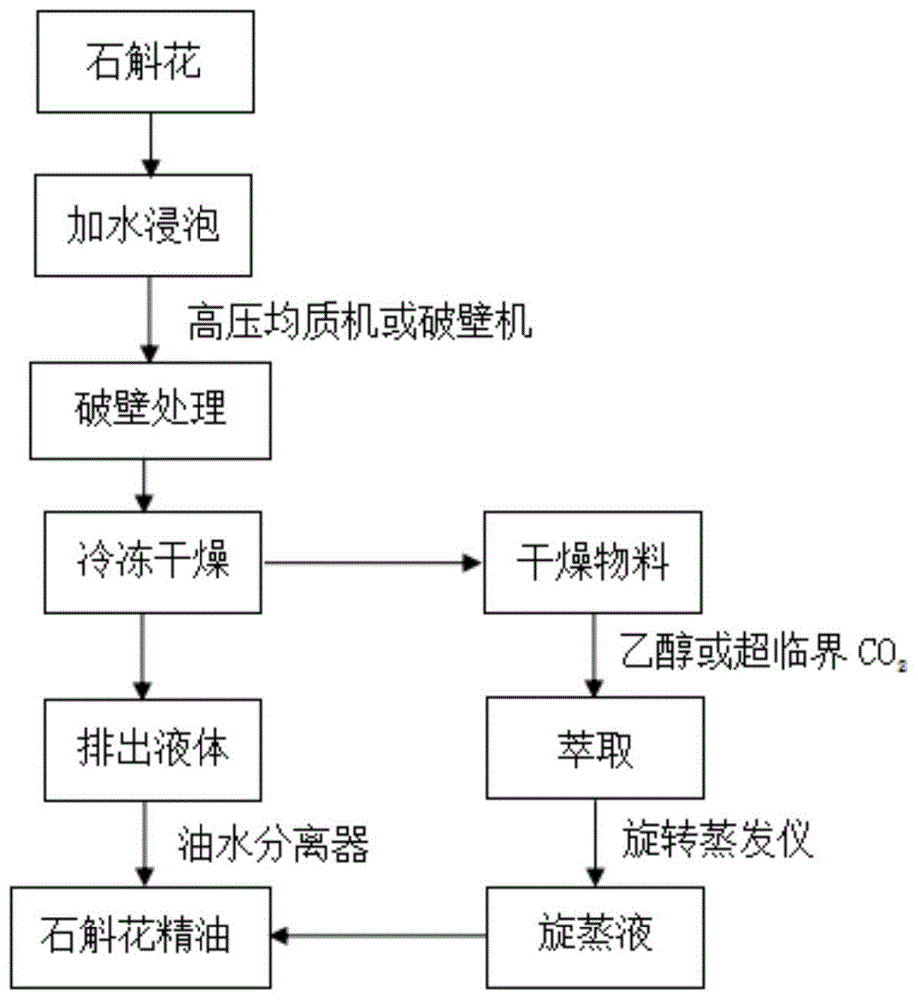 本发明公开了一种石斛花精油的提取方法,将石斛花用水浸泡后进行破壁处理,使其细胞充分破碎后进行冷冻干燥,收集冷凝器排出的液体并分离油层,获得部分石斛花精油;再用溶剂或超临界CO
